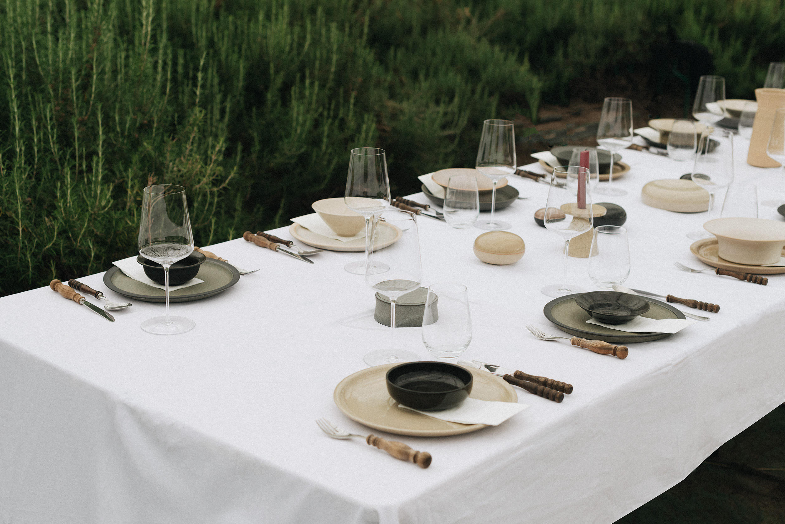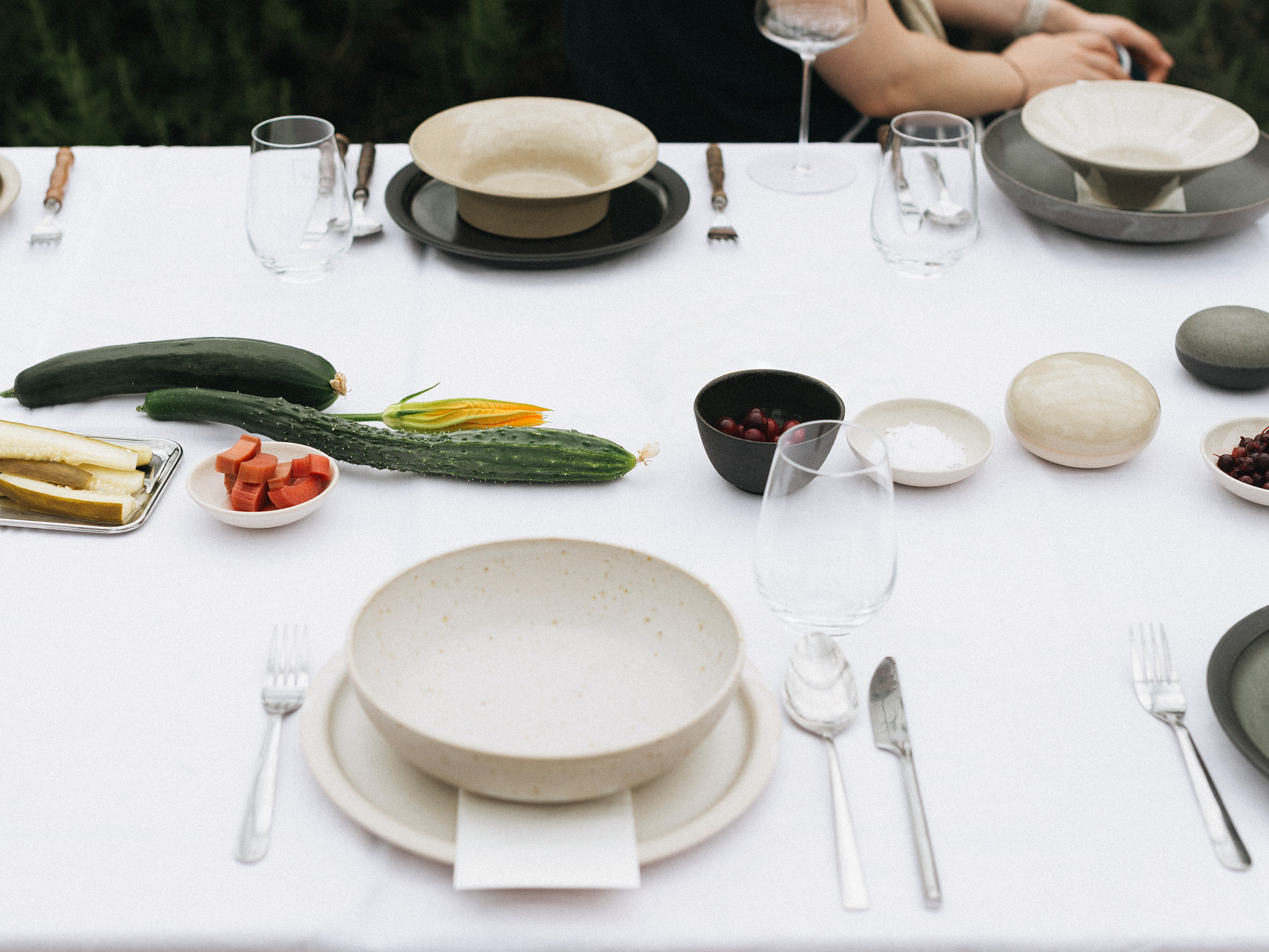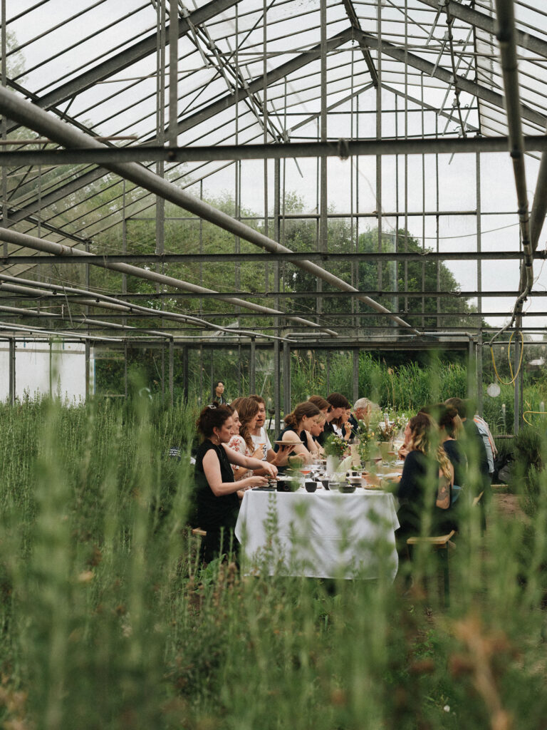 Das Dinner endete an einer langen Tafel im Rosmaringewächshaus, gedeckt mit Keramiken, die im letzten Jahr seit unserer Gründung als Prototypen entstanden sind und hier erstmals ihren Platz gefunden haben. Am Ende des Abends konnten die Gäste das Geschirr, von dem sie gegessen und getrunken hatten, auch kaufen.